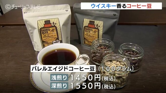 「バレルエイジドコーヒー」は浅煎りと深煎り、いずれも1パック100グラムで、きょうから「水の時計」、今月29日から若鶴酒造大正蔵で販売されます。