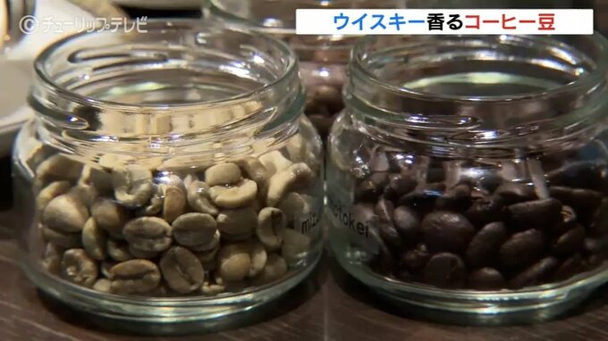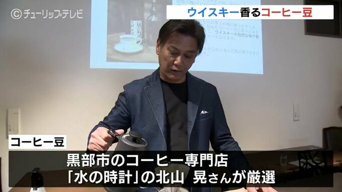 豆は黒部市のコーヒー専門店「水の時計」の北山晃さんが厳選したもので、黒部の名水に浸し抽出することでウイスキー樽がほのかに香り、歳月を経たウイスキーを思わせる深い味わいがあります。