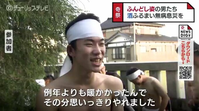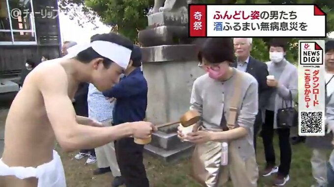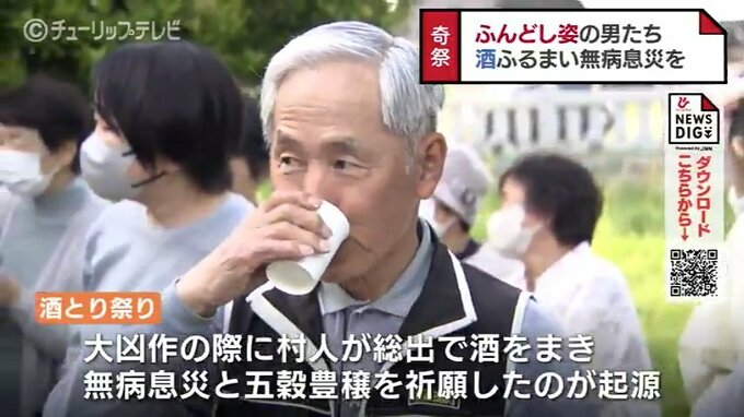 ふんどし姿の男たちは参拝者に酒を多くふるまえばふるまうほど、参拝者は酒を多くかけられるほど幸せを呼び込めると言われていて、28日は地元の若者たちらが祭りを盛り上げました。