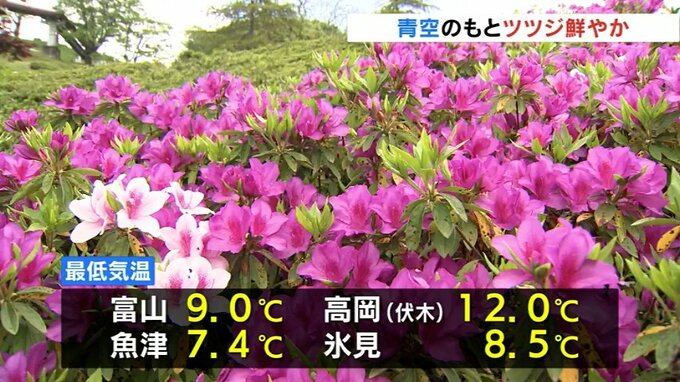 2日朝の県内は青空が広がるもやや冷え込み、最低気温は魚津で7.4℃と4月中旬並み、富山では9.0℃と12日ぶりに朝の最低気温が10℃を下回りました。