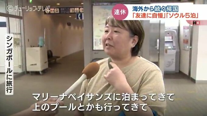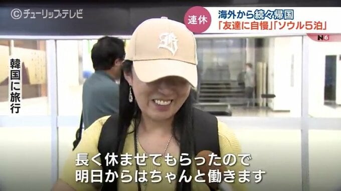 女性「韓国です。ソウルに。5泊」女性「私だけ10連休させてもらったので、長く休ませてもらったので明日からはちゃんと働きます」