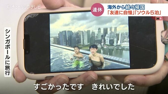 母親「マリーナベイサンズに泊まってきて、上のプールとかも行ってきて、すごかったです。きれいでした」「子供が小さいうちしか旅行行けないし、大きくなって生活の時間が違ったらなかなか行けないから」