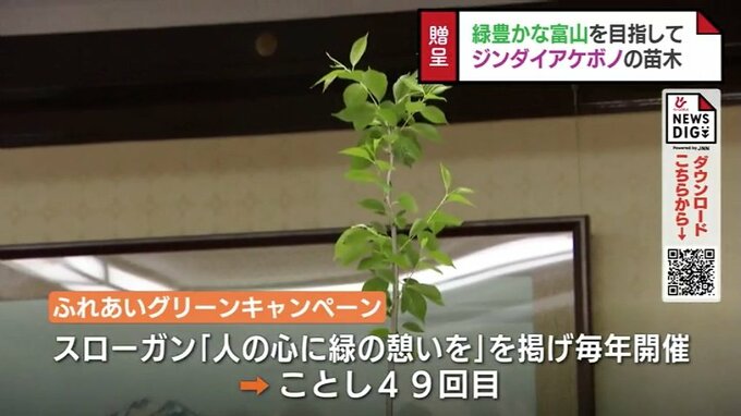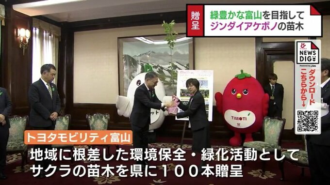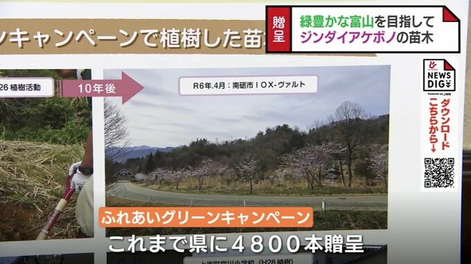 富山県に贈られた苗木は、これまで4800本にのぼっていて、トヨタモビリティ富山の品川祐一郎社長は「今後も緑あふれる美しい富山の実現に協力するため、キャンペーンを続けていきたい」と話していました。