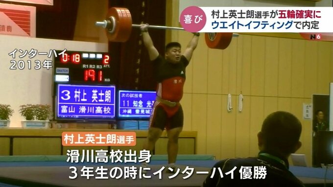 村上選手はウエイトリフティング部がある滑川高校出身で3年生の時にはインターハイ・ウエイトリフティングで新記録を出し、優勝。