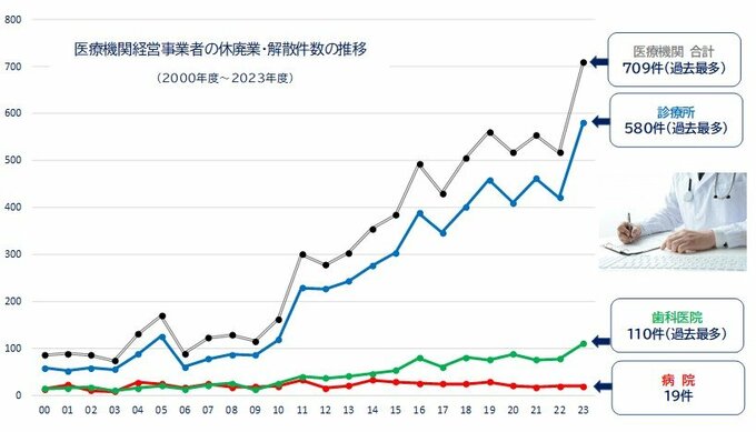 病院や診療所、歯科医院など「医療機関の休廃業・解散」が2023年度は709件の過去最多であったことが帝国データバンクのまとめでわかりました。709件は医療機関の倒産の12.9倍、10年前の2.3倍で、帝国データバンクは、高齢化が進むなか、地域の「診療所」が今後も姿を消していくだろうと指摘しています。
