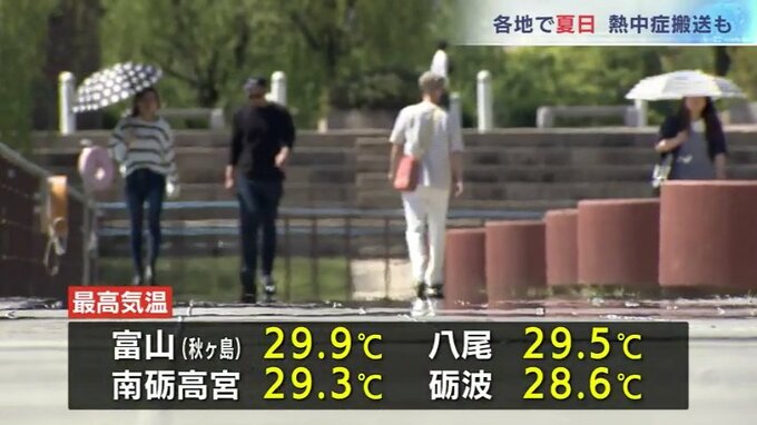 日中の最高気温は富山市秋ヶ島で真夏日一歩手前の29.9℃南砺高宮で29.3℃などと各地で6月中旬から7月中旬並みの汗ばむ陽気となりました。