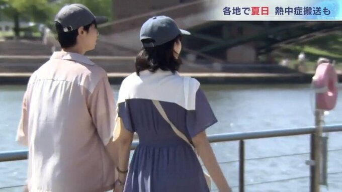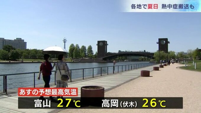 こうしたなか富山市の富岩運河環水公園では半そで姿の人や日傘で日差しをさえぎる人の姿が見られました。