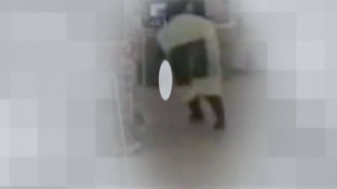 白っぽいポンチョのようなものを着た男が、店内を物色しながらうろつく様子や走り回る映像が映っています。