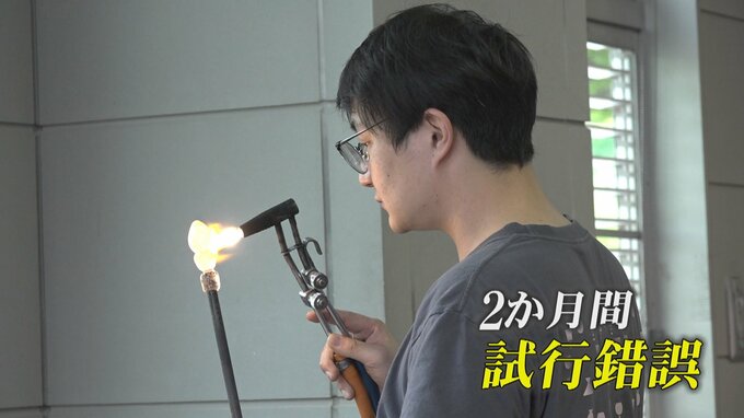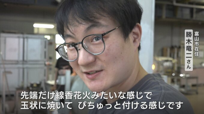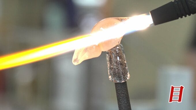 ガラス作家 勝木竜二さん:「この辺がガラスの黒とか白の棒なんで…。先端だけ線香花火みたいな感じで、玉状に焼いて、ぴちゅっと付ける感じです。ズレると変わってくるので、手はプルプルします」