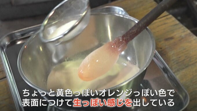 ガラス作家 勝木竜二さん:「これは色のガラスの粉なんですよ。ちょっと、黄色っぽいオレンジっぽい色で表面につけて、生っぽい感じを出しているんです」