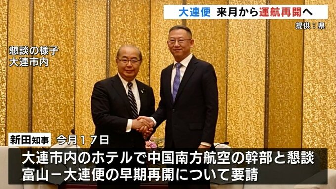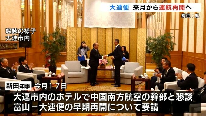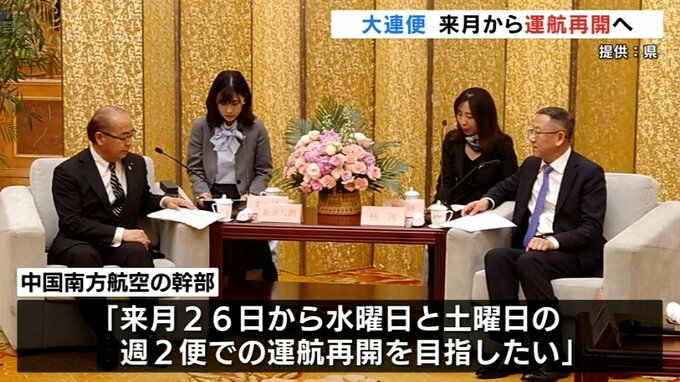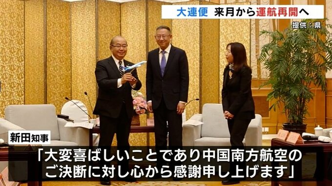 県によりますと5月17日に中国訪問中の新田知事が大連市内のホテルで大連便を運航する中国南方航空の幹部と懇談。