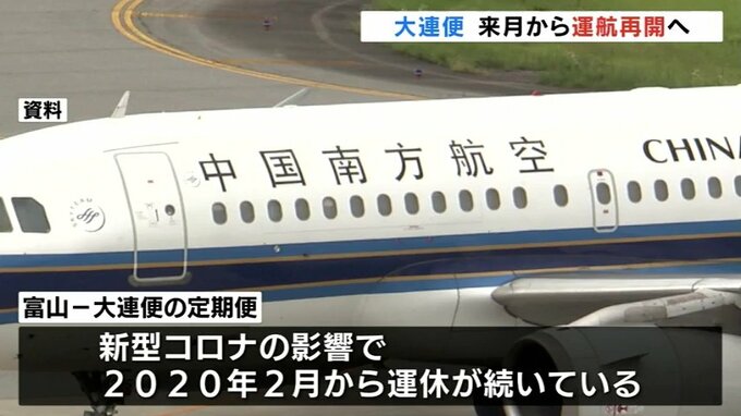 新型コロナの影響で運休が続いている富山と中国の大連を結ぶ定期便の運航が、6月から再開される見通しとなりました。