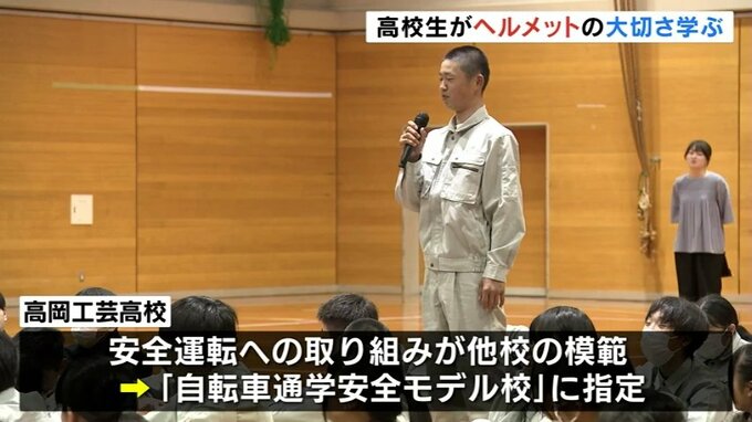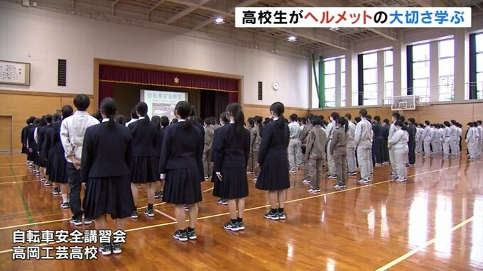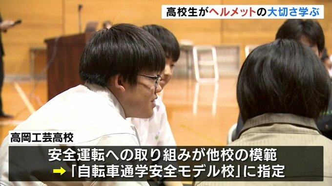 ヘルメット着用が義務化されてから1年が経過し、富山県立高岡工芸高校では高校生たちがヘルメット着用の重要性を学びました。