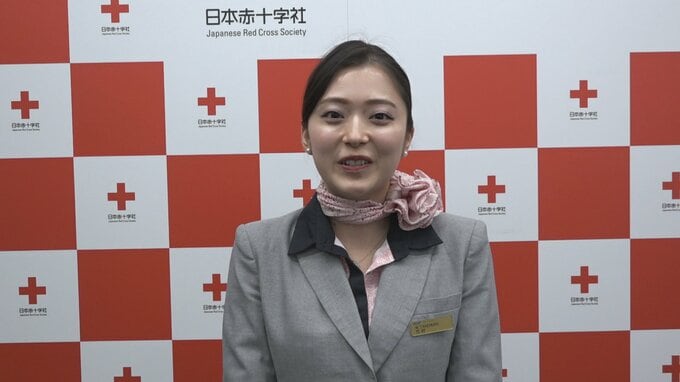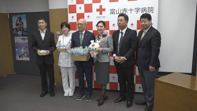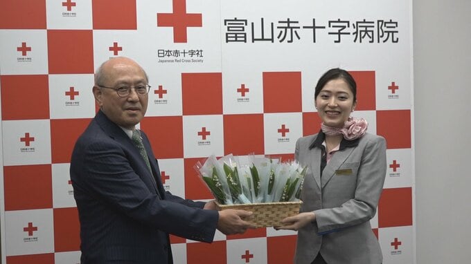 砺波市出身でANAグループの客室乗務員竹村和香奈さんが、富山赤十字病院を訪れ、スズランの花束と、スズランのさわやかな香りが漂う「しおり」を贈りました。