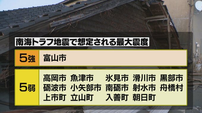 政府のまとめでは、南海トラフで巨大地震が発生した場合に県内で想定される最大震度は、富山市で震度5強、そのほかの市町村は震度5弱となっています。