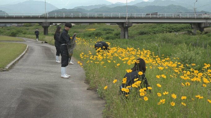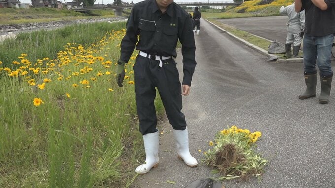 生態系に影響を与える特定外来生物「オオキンケイギク」の駆除の作業が20日、富山県の上市川で行われました。
