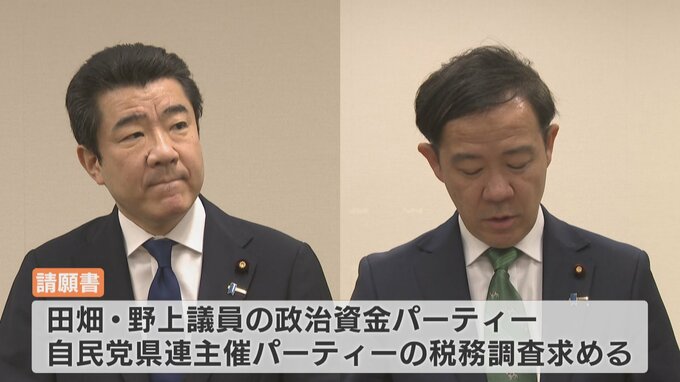 5人は、政治資金パーティーは「興行」であり、そこで得た収入は「雑所得」で課税対象にあたると主張。田畑・野上両議員の政治資金パーティーに加え自民党県連主催のパーティーについても税務調査の実施を求めています。