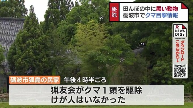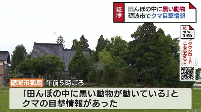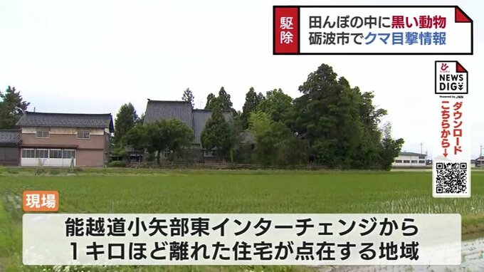 砺波市によりますと、27日午前5時ごろ、砺波市狐島で「田んぼの中に黒い動物が動いている」とクマの目撃情報がありました。
