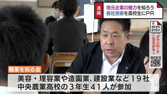 29日、美容理容業や造園業、建設業などから19社が参加し、中央農業高校からは全3年生41人が参加しました。