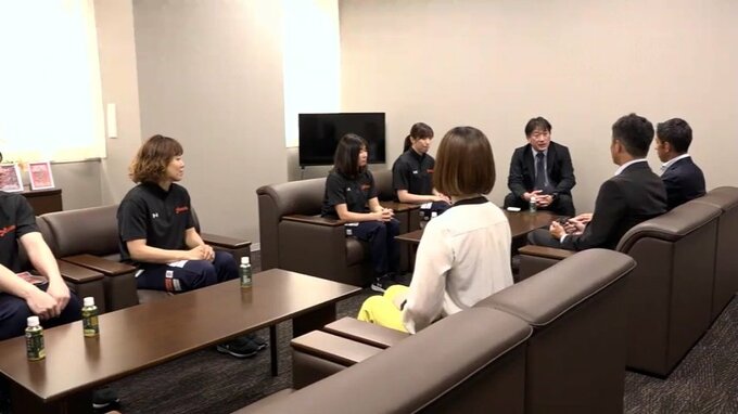 チューリップテレビを訪れたのは射水市の女子ハンドボールチームアランマーレ富山のキャプテン檜木選手やエースの横嶋選手らです。