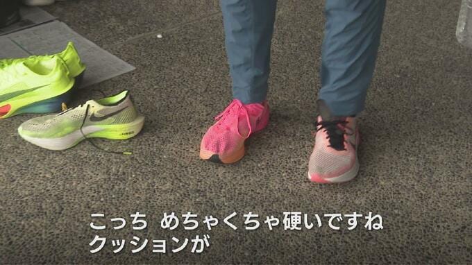 「(偽物は)めちゃくちゃ硬いですね、クッションが。反発は割とあるんですけど、クッションが多分違う素材なので、その硬いクッションのはずみで弾んでるのかな。本物はちゃんとしたズームエックスっていう柔らかい、すごい反発すごい素材使ってるんですけど、こっち(偽物)あんまり…ただの硬いクッションみたいな感じですね」