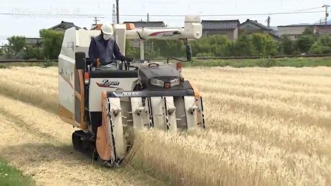 黒部市宇奈月町の麦畑では、ビール用の二条大麦「ミカモゴールデン」が収穫の時期を迎え、黄金色に実った穂が次々と刈り取られていました。