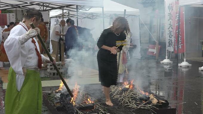 参拝者たちはそれぞれの願い事が書かれた「護摩木」を火の中に投げ込んだ後、住職に続いて熱い灰の上をはだしで渡っていきました。