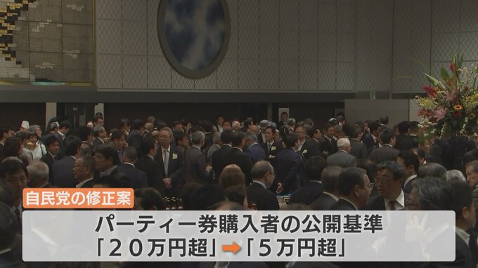 自民党がまとめた修正案では、パーティー券の購入者の公開基準について今の「20万円超」から「5万円超」に引き下げるとしています。