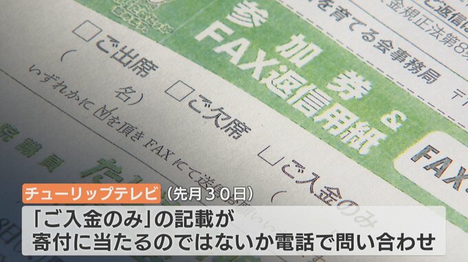 チューリップテレビは5月27日、政治資金パーティーについて、開催の目的や裏金事件が問題となる中で有権者の理解を得られるかといった内容の質問状を田畑議員の事務所に送り、さらに5月30日には「ご入金のみ」の記載が寄付に当たるのではないかと電話で問い合わせました。