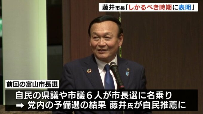 藤井市長は、初当選した前回の市長選で、自民の県議や市議6人が市長選に名乗りを上げる中、党内の予備選を勝ち抜き自民の推薦をつかみとった経緯があります。