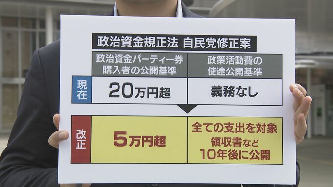 自民党が作成した改正案には政治資金パーティー券購入者の公開基準を「20万円超」から「5万円超」に引き下げたほか、党から議員に支給される「政策活動費」について、10年後に領収書を公開することなどが盛り込まれました。