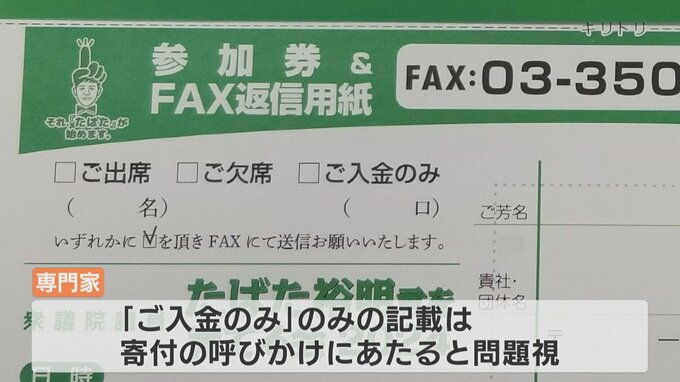 「ご入金のみ」の記載は寄付の呼びかけに当たるとして専門家が問題視しています。