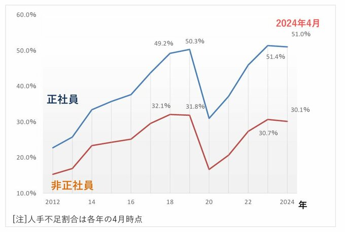 それによりますと、正社員の「不足」と感じている企業の割合は51.0パーセント、非正社員でも30.1パーセントが「不足」と感じています。