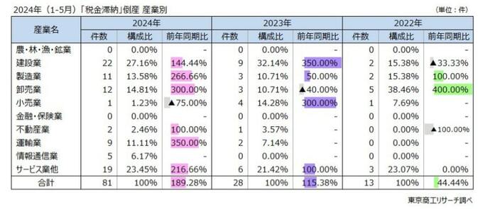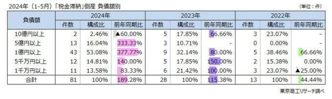 東京商工リサーチによりますと「税金滞納」倒産は、小・零細規模よりも中小企業レベルでの発生が中心で、税金滞納が負債額を押し上げる側面があるとしています。