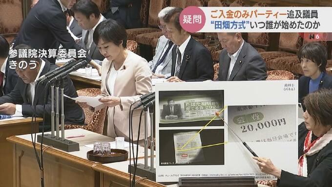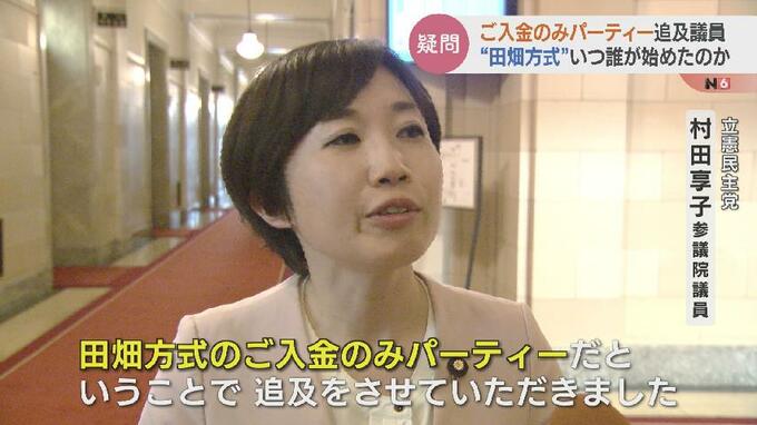 立憲民主党 村田享子議員:「パーティーに出席はしないけれども、“お金だけもらいますよ”ということで、これはもう明らかに脱法というか違法なパーティーだと思います。そういう意味でもうこれは、“田畑方式のご入金のみパーティー”だということで追及をさせていただきました」