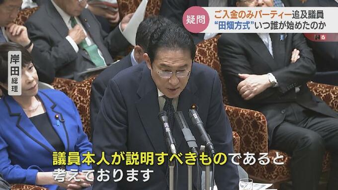 岸田総理:「このパーティー自体がどのように運営されているか、これについて、実態をしっかり把握した上で判断すべきものである。いずれにせよ、そのご指摘の点については、議員本人が説明すべきものであると考えております」