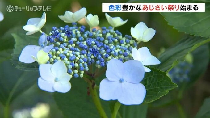 色とりどりのアジサイが楽しめる恒例のあじさい祭りが富山県射水市の太閤山ランドで14日開幕しました。