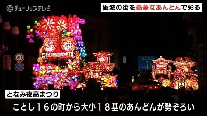 この「となみ夜高まつり」は、五穀豊穣を願って大正時代から続く伝統行事で、ことしは、16の町から大小18基のあんどんが勢ぞろいしました。