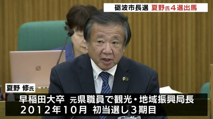 夏野氏は早稲田大学卒。元県職員で観光地域振興局長などを務め、2012年の市長選に立候補し初当選、その後は無投票で3期目を務めています。