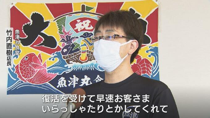 魚津丸食堂 竹内直樹店長:「やっぱりバイ飯を食べに来られるお客さんはけっこうたくさんいらっしゃったんで、復活を受けて早速お客さま、いらっしゃたりとかしてくれて大変うれしい反響がありましたので」