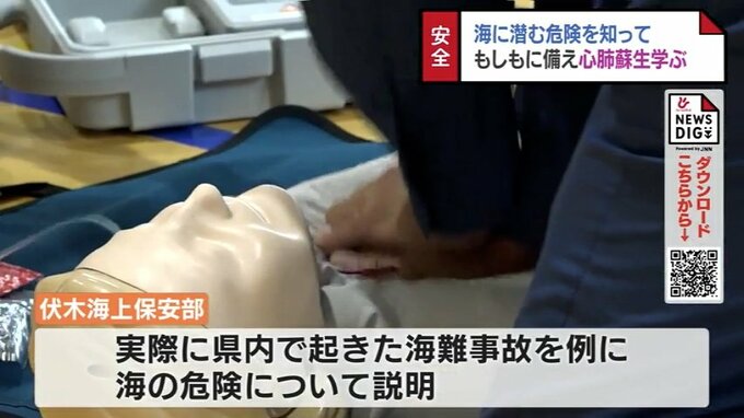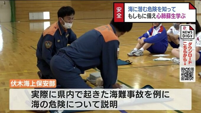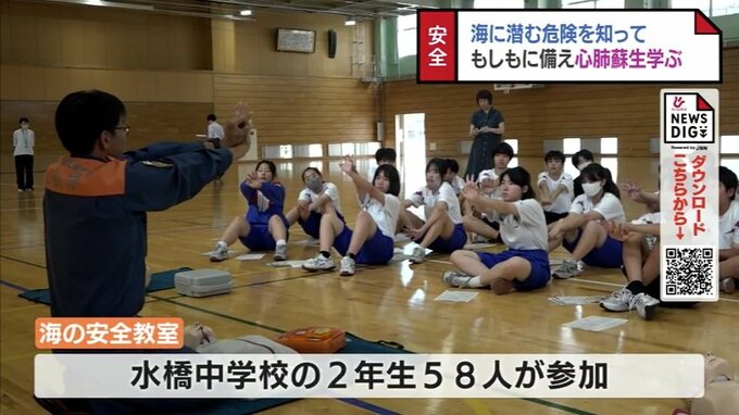 海水浴シーズンを前に中学生が海に潜む危険や、もしもの時の心肺蘇生法を学びました。教室は日本水難救済会が行っているもので、この日は富山市の水橋中学校の2年生58人が参加しました。