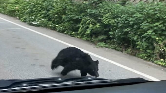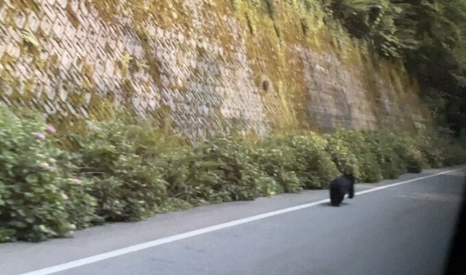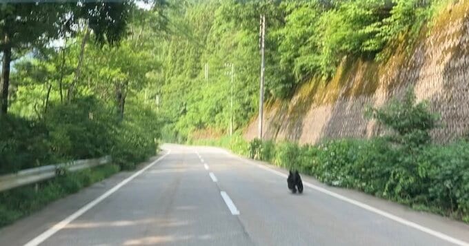 山間部の国道でクマ2頭に遭遇、1頭はやぶに逃げ、もう1頭は取材クルーの車に向かってきます。あわや正面衝突かと思いきや、クマはすんでのところで車をかわし走り去っていきました。