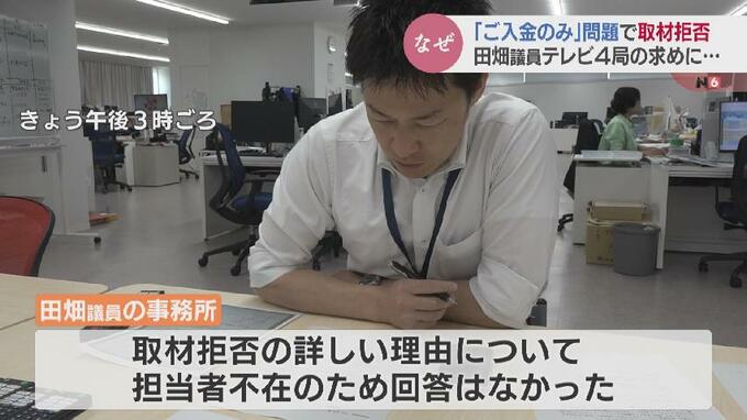 田畑議員は県内のテレビ4局による合同インタビューを拒否。書面で答えた通りだとしました。チューリップテレビはきょう、田畑議員の事務所に取材拒否の詳しい理由について問い合わせましたが、担当者不在のため、回答はありませんでした。