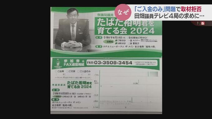 自民党の田畑裕明 衆議院議員の政治資金パーティーについて、パーティー案内状にあった「ご入金のみ」の意図について、チューリップテレビは富山県内3つの放送局と合同で田畑議員にインタビュー取材を申し込みました。しかし、田畑議員の事務所は「今回の取材は見送りたい」と取材を拒否しました。