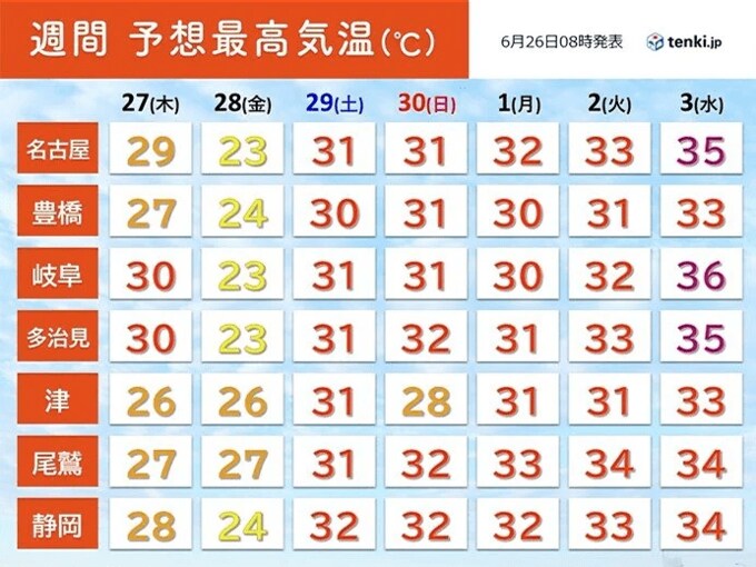来週は連日、真夏のような厳しい暑さとなりそうです。26日(水)以降、西日本の南岸に停滞する梅雨前線に伴う雨雲が東海地方にもかかるため、雨の降る所がある見込みです。