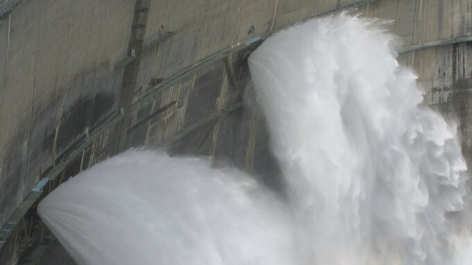 放水は、下流の景観維持を目的に毎年この時期に行われていて、壁面の高さで日本一の186メートルを誇るアーチ式ダムから毎秒15トンの水が放出されます。