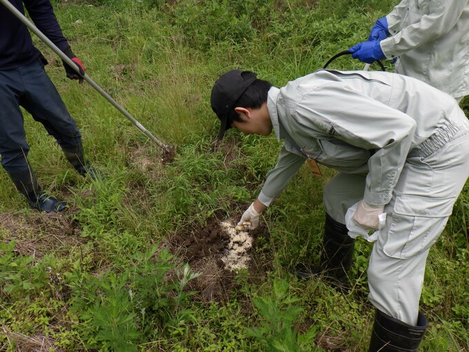 野生のイノシシを媒介とした豚熱の感染拡大防止のため27日、富山県の入善町と上市町で豚熱経口ワクチンの屋外散布がおこなわれました。9月までの間に富山県内286か所、5720個を屋外散布します。