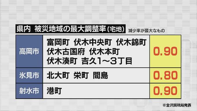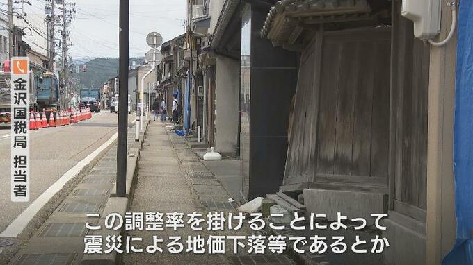 金沢国税局担当者:「1月1日の路線価につきましては、今回の震災を踏まえる前という額になっておりますので、この調整率を掛けることによって震災による地価下落等であるとか、そういった減額要素を反映させるという措置になります」