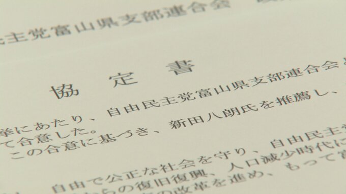 今秋の富山県知事選挙へ向けて、現職の新田知事を推薦する自民党県連と新田知事が政策協定を結びました。新田知事と県連が政策協定を結んだのは今回がはじめてです。