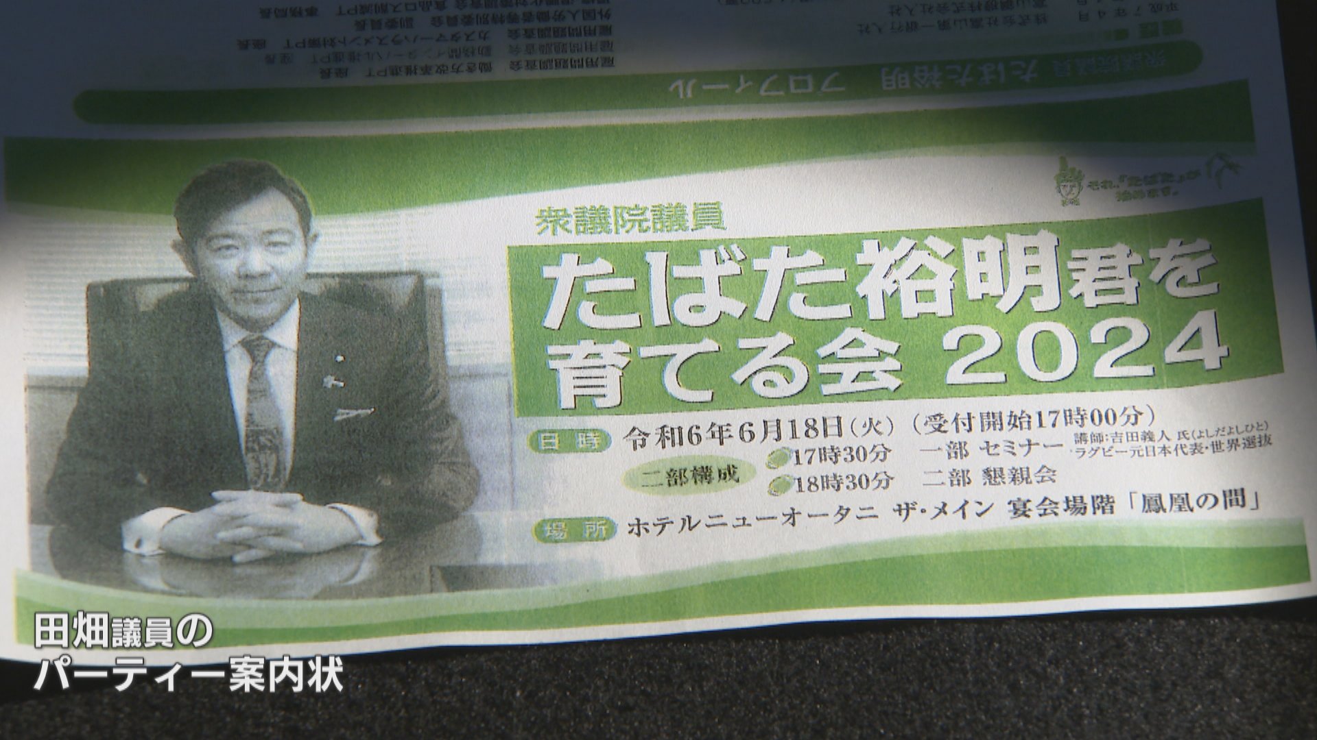 田畑議員を巡っては、先月開催予定だった政治資金パーティーの案内状にあった「ご入金のみ」の項目が、違法な寄付の呼びかけに当たると指摘されています。